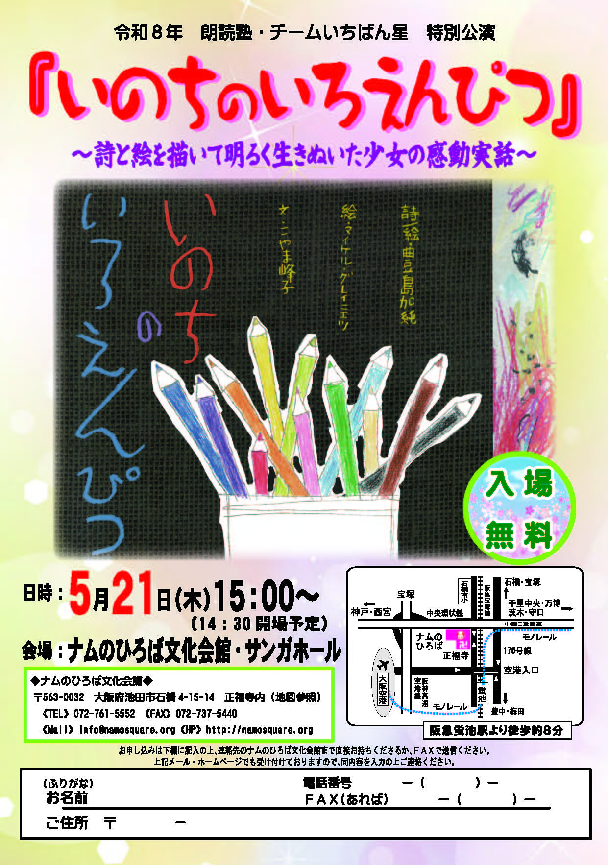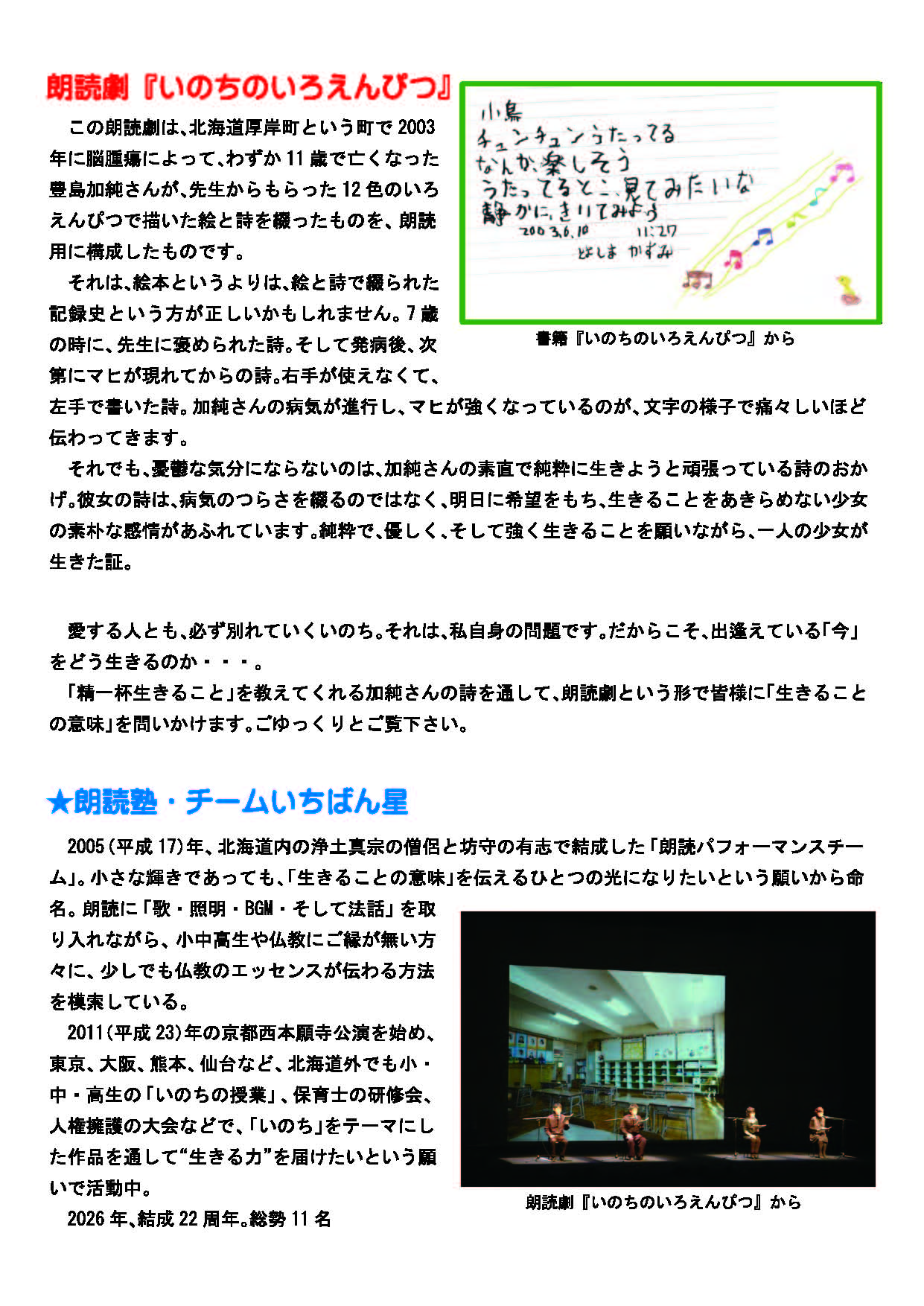 〈朗読塾・いちばん星〉の特別公演「いのちのいろえんぴつ」が行われることに